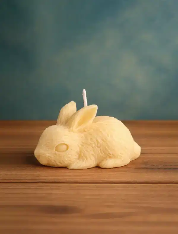 Lumânare decorativă în formă de iepuraș, realizată manual din ceară naturală de soia și așezată într-un suport elegant din sticlă tip bombonieră.
